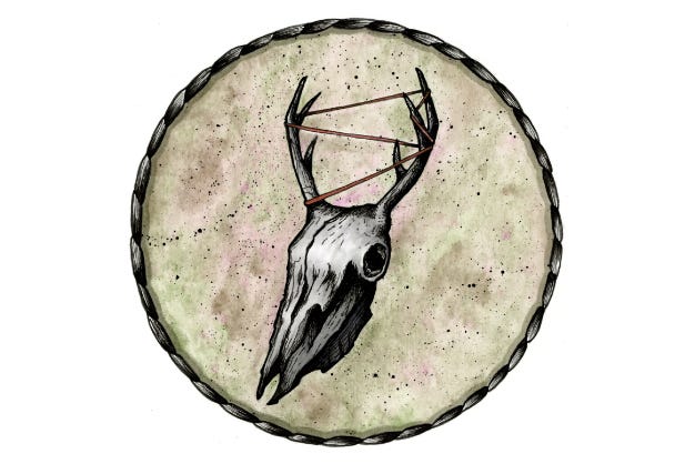 That account of faulty reasoning, which will not appear in my journal, brings me to this morning when, sleepy-headed and in need of a cigarette, I opened the cabin door to find a rotting deer skull on my porch. The experience triggered a brief shrieking episode, about which I am unashamed, but once the shock had passed, I dropped to my haunches and examined the artefact more closely. The deer’s neck had been severed cleanly, just below the upper jaw. Most of the tissue and skin were gone, and the eye sockets were empty. I could see no sign that scavengers had gnawed at the skull, it seemed pristine, as though the animal had been killed and kept, and stranger still, ribbons of dirty red fabric had been crudely wrapped around and between the deer’s antlers. The skull looked as though it had been gift-wrapped by a very young child.